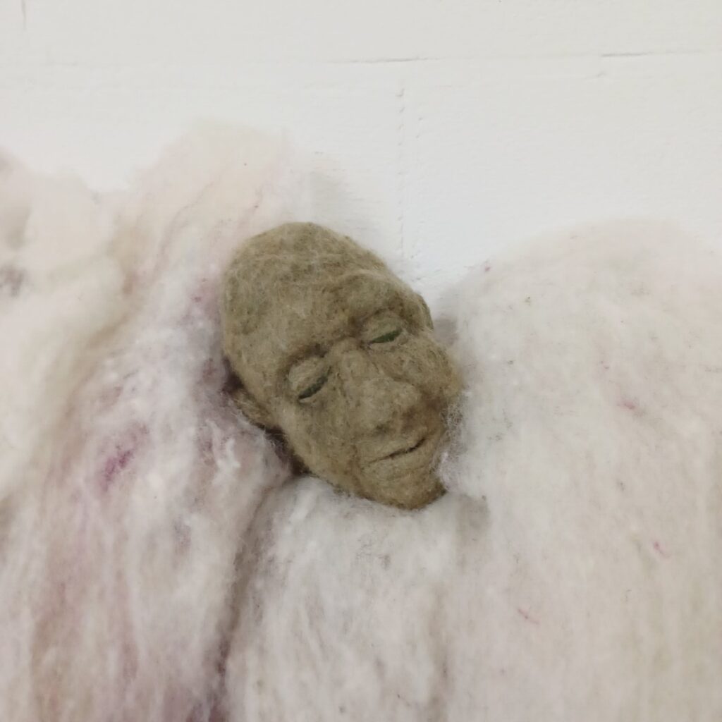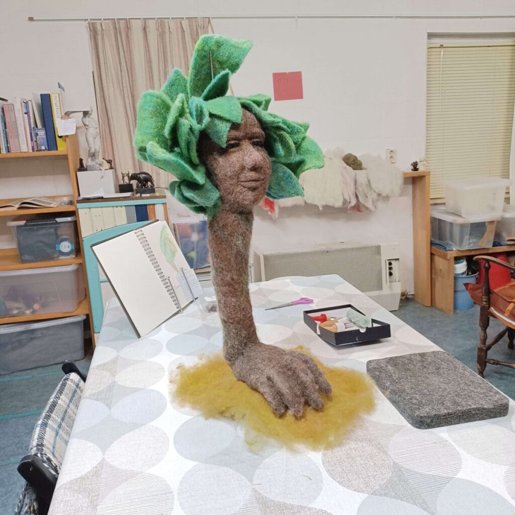In 2022 onderzocht ik voor het eerst wol in het algemeen en naaldvilten in het bijzonder als alternatief voor brons. Wol heeft veel potentieel en beelden van vilt zijn in ieder opzicht milieuvriendelijker in de productie dan brons. Het maken van een beeld of pop is als boetseren met wol. Een van de verrassingen is dat het maken van een armatuur nagenoeg hetzelfde gaat als bij het maken van een beeld in boetseerwas. Een verschil: de vele kleuren waaruit ik kan kiezen. Ik heb veel geleerd van de tutorials van Sarafina Fiber Art. Deze kan ik iedereen aanraden. Vanaf april 2025 start ik om het materiaal wol en de techniek van het naaldvilten onder een breder publiek onder de aandacht te brengen op een speelse manier. Dit doe ik middels WolWilWel naaldvilt workshops in mijn atelier in de Hoven of op een door u gekozen locatie.